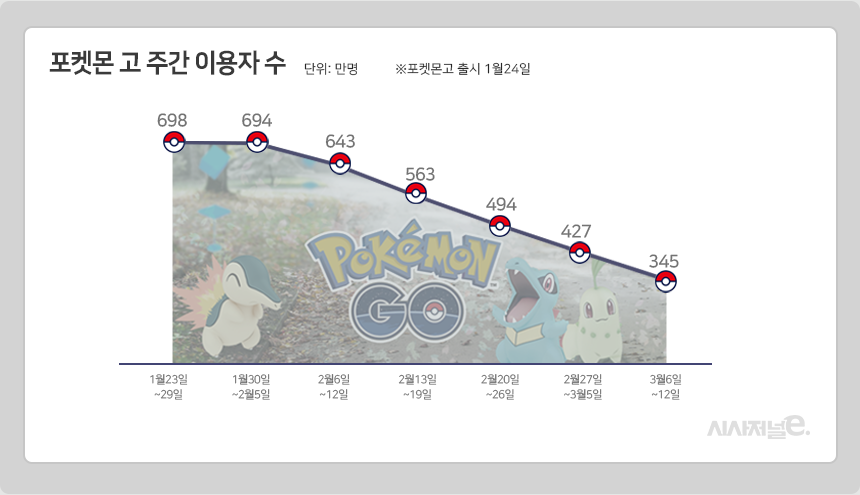 앱 조사업체인 와이즈앱에 따르면 지난 6~12일 포켓몬 고 이용자는 345만명으로 조사됐다. 이는 지난 1월 출시초기 이용자 수인 698만명의 절반 수준이다. 포켓몬 고는 출시 첫 주에 정점을 찍은 후 매주 이용자 수가 감소하는 양상을 보여왔다.