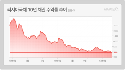 지난해와 달리 러시아 국채 투자도 마냥 밝지만은 않다. 21일 기준 러시아 10년물 국채 수익률은 7.96%로 지난해 1월 10일 10.67%에서 2.71%포인트 떨어졌다. 그만큼 러시아 국채 가격이 큰 폭으로 상승했다. 2010년 이후 러시아 국채가 가장 비쌌던 2013년 4월 1일 6.5% 수익률과 비교하더라도 큰 차이를 보이지 않고 있다.