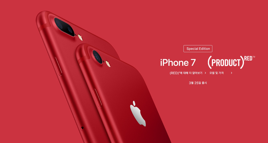 21일(현지시간) 애플은 지난해 9월 출시한 아이폰7과 아이폰7플러스에 빨간색을 추가한다고 밝혔다. 빨간색을 입힌 스포츠밴드·아이팟·액세서리 등도 출시한다. 삼성전자의 신제품을 견제하기 위한 컬러마케팅이다. 빨간 아이폰은 오는 24일부터 한국, 미국, 중국 등 40개국에서 한정판으로 판매된다. 용량과 기능은 기존 아이폰7 시리즈와 같다.