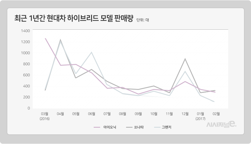 문제는 최근 1년 사이 이 세 개 차종 판매량이 줄줄이 하락하고 있다는 점이다. 올해 들어 하락세는 더 가팔라졌다. 지난달 그랜저HG 하이브리드는 159대, 쏘나타 하이브리드 336대, 아이오닉 하이브리드 241대 판매됐다. 각각 전년 동월대비 70.8%, 43.1%, 81.6% 판매가 급락했다.