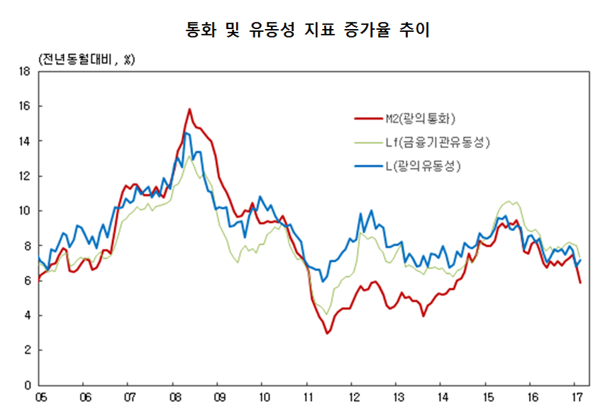 한국은행이 11일 발표한 ‘2017년 2월중 통화 및 유동성 동향’에 따르면 원계열·평잔 기준 시중통화량(M2·광의통화)은 2420조2856억원으로 지난해 같은 기간 대비 5.9% 증가했다. 전년동기대비 M2 증가율이 5%대로 떨어진 것은 2014년 4월 5.5% 증가 이후 처음이다.