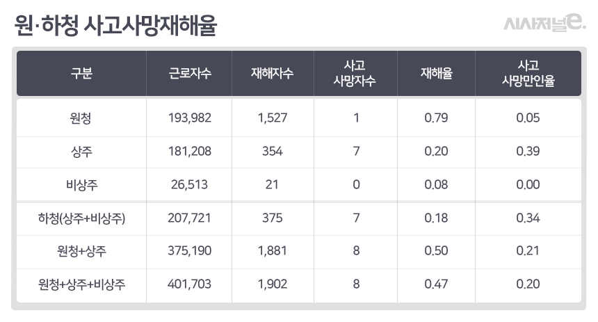 하청업체 근로자의 사고사망만인율(0.34)이 원청(0.05)의 약 7배에 이르는 것으로 드러났다. 사망 만인율은 근로자 1만명당 발생하는 사망자 수의 비율이다.