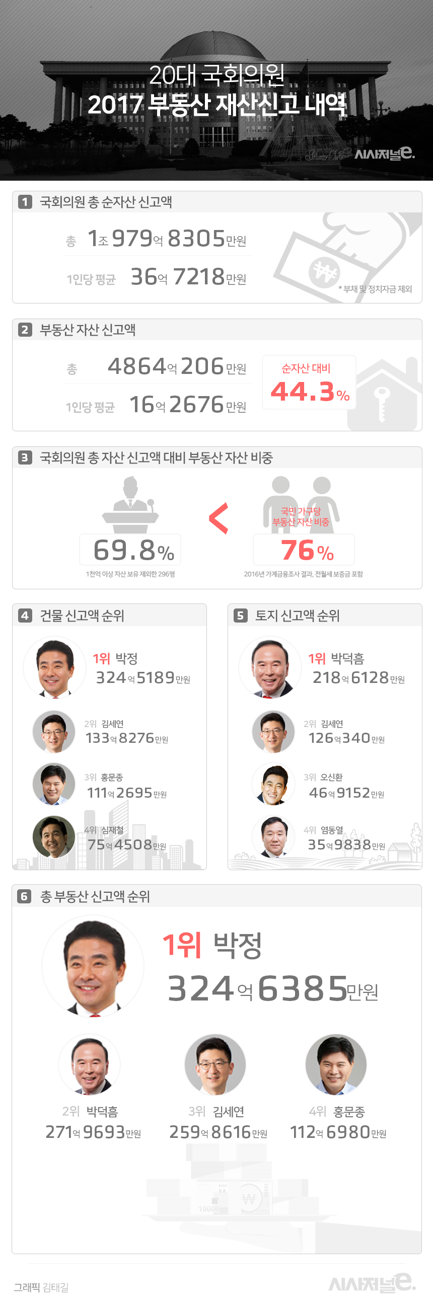시사저널e는 국회의원들이 보유한 자산 중 부동산 자산의 현황과 자산 형성 과정의 추이를 살펴보기 위해 국회의원과 배우자 등 공직재산 대상자들이 신고한 자산 내역을 분석했다. 분석한 자산 내역 자료는 지난달 말 공개된 국회의원 299명(재적의원 기준)의 ‘2017년 재산변동 신고보고서’를 토대로 했다.