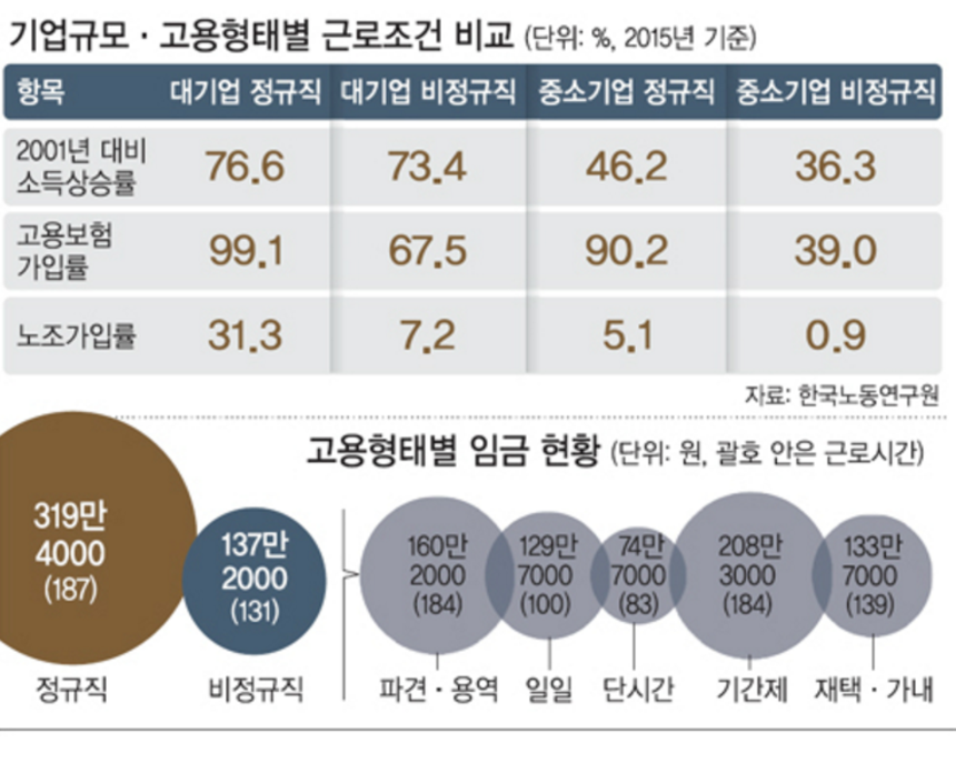 양극화, 저성장, 불평등이 만나는 지점에는 비정규직 문제가 자리한다. 지난 1월 정규직(434만원)과 비정규직 근로자(157만원)간 급여 편차가 사상 최대로 벌어진데다 비정규직 근로자 비율은 점차 상승하고 있다. 2015년 기준 비정규직 비중은 한시적 근로자 364만명과 시간제 224만명, 파견·용역 87만명 등 전체 근로자의 32.5%였다. 여기에 정규직으로 분류된 사내하청 근로자 93만명과 자영업자로 분류된 특수형태근로종사자를 포함하면 비정규직 비율이 42.5%로 늘어난다.