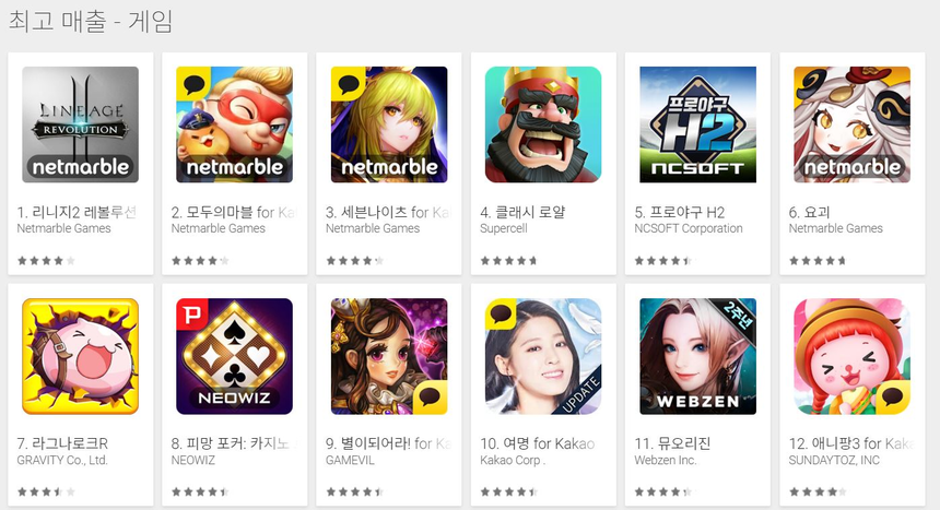 넷마블 1위부터 3위까지 싹쓸이…넥슨, 10위권안에 전무