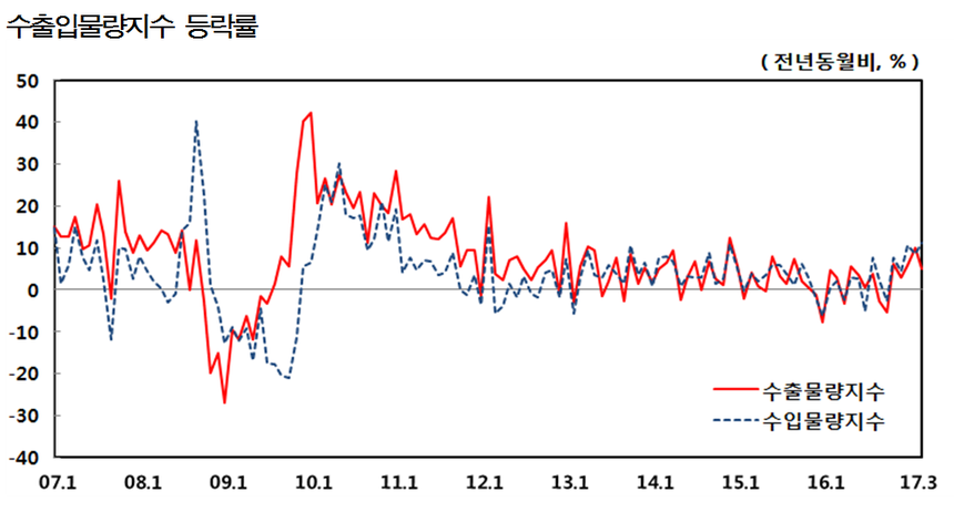 수입 물량도 늘면서 교역 규모가 확대되고 활발해졌음을 나타냈다. 수입물량지수는 139.16으로 지난해 3월보다 11.2% 올랐다. 이 역시 관련 통계를 낸 이후 사상 최고치로 집계됐다. 전년 대비 상승률은 2012년 2월(15.3%) 이후 5년 1개월 만에 가장 높았다.