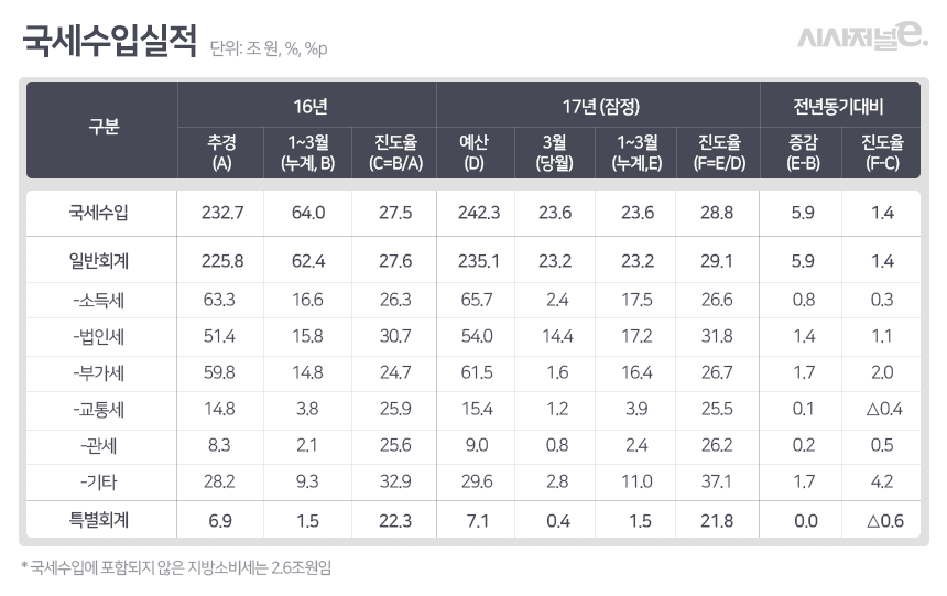 부가가치세 역시 수입액 증가 등으로 전년 동기 대비 1조7000억원 증가한 16조4000억원으로 나타났다. 부가가치세의 세수진도율은 26.7%였다.