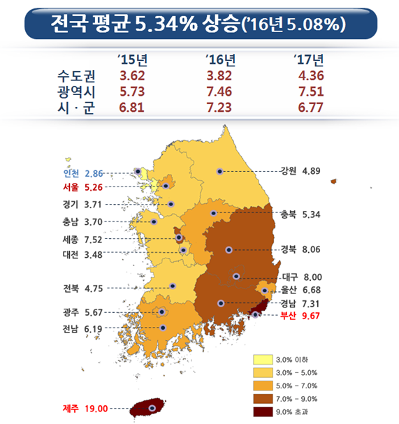 올해 공시지가 상승률은 10년 새 가장 높다. 지역별 개발호재가 영향을 미쳤다. 국토부 관계자는 “정부‧공공기관의 지방이전에 따른 기반시설 확충 등 투지수요 증가, 제주‧부산 등 일부 지역의 활발한 개발사업 등이 주된 원인으로 분석된다”고 설명했다.