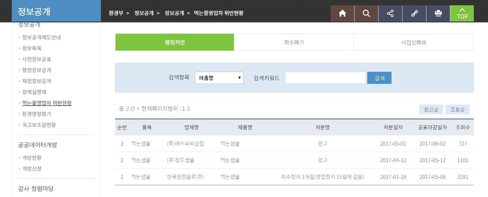 지난 1월부터 환경부 행정처분을 받은 먹는샘물 업체는 총 3곳이다. SPC삼립과 청도샘물은 경고, 한국청정음료는 취수정지 1개월 처분을 받았다. 환경부는 홈페이지에 행정처분 품목, 업체명, 처분명, 처분일자, 공표마감일자 등은 올렸지만 정작 가장 중요한 제품명과 위반 내용이 빠져있다.