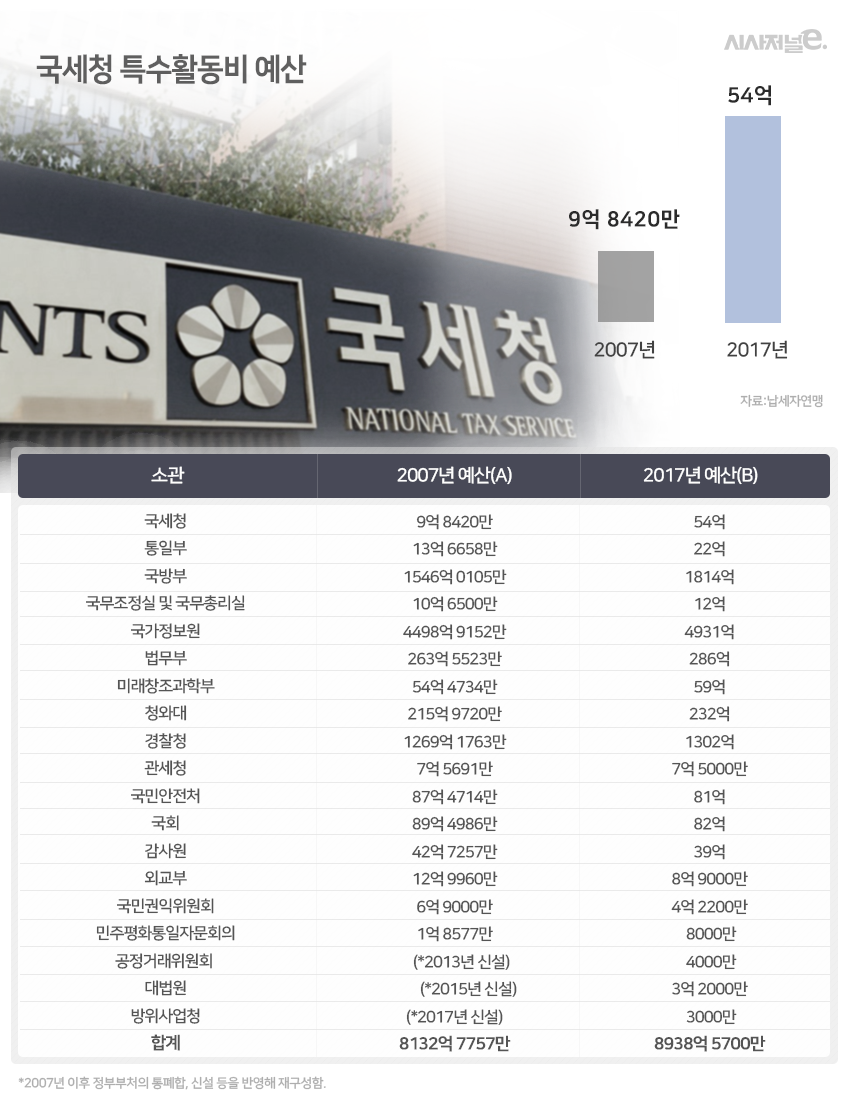 1일 납세자연맹에 따르면 국가정보원을 제외한 올해 부처별 국가예산 중 특수활동비의 비중이 가장 큰 부처는 청와대로 지출예산액 1794억의 12.9%에 해당하는 232억원이 책정됐다. 특수활동비가 편성된 19개 기관 중 2007년도에 비해 가장 많은 예산이 배정된 곳은 국세청으로 11년전 보다 무려 5.5배 증액된 것으로 나타났다.