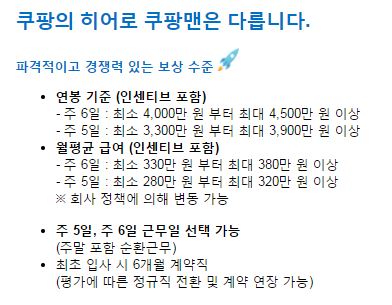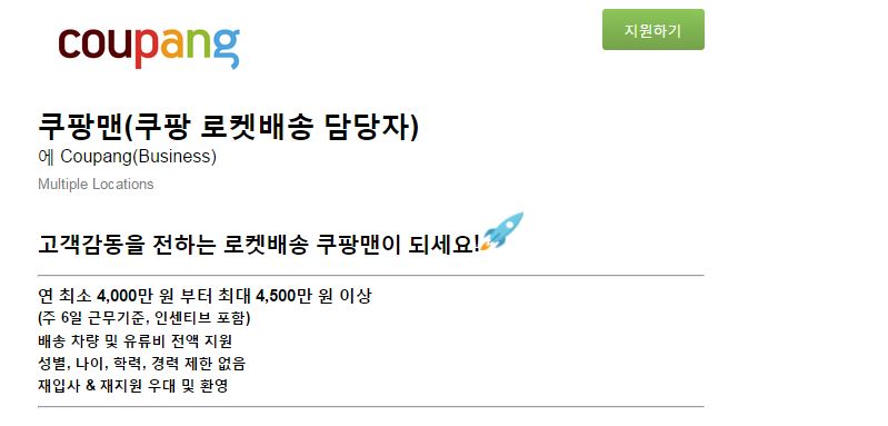 2일 업계에 따르면 소셜커머스 업체 쿠팡은 현재 쿠팡맨을 모집 중이다. 쿠팡은 ‘고객감동을 전하는 로켓배송 쿠팡맨이 되세요’라는 문구와 함께 쿠팡맨 모집 공고를 올렸다. 최초 입사 시 6개월 계약직(평가에 따른 정규직 전환 및 계약 연장 가능)과 함께, 연 최소 4000만원 부터 최대 4500만 원 이상(주 6일 근무기준, 인센티브 포함), 배송차량 및 유류비 전액 지원, 성별·나이·학력·경력제한 없음 등 내용이 게재돼 있다.