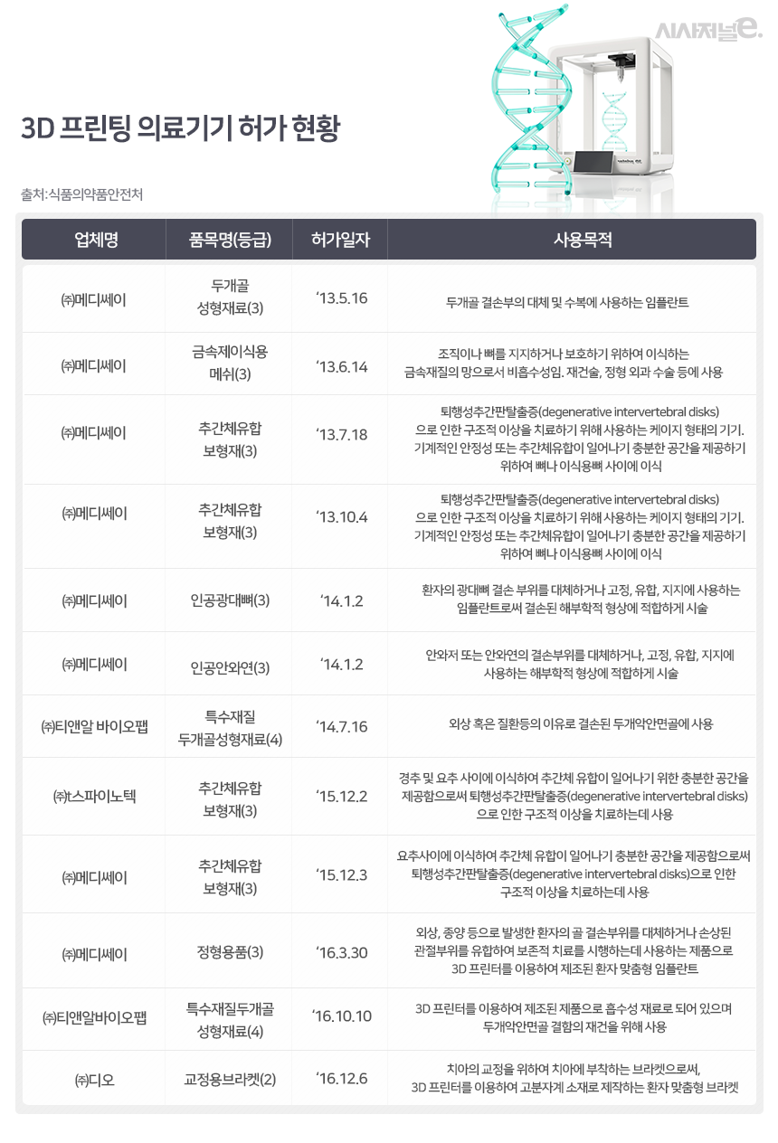 3D프린팅 의료기기 허가 품목은 두개골 성형재료, 추간체유합 보형재, 인공광대뼈, 특수재질 두개골 성형재료, 교정용 브라켓 등이다.