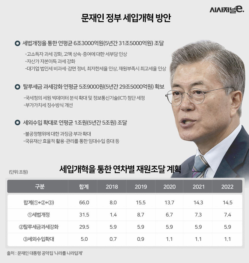 문재인 대통령의 공약집에 따르면 새 정부는 세법개정, 세금탈루 과세강화, 세외수입 확대 등으로 5년간 총 66조원의 재원조달 계획을 갖고 있다. 이 중 세법개정을 통해 향후 5년간 31조5000억원(연평균 6조3000억원)이 걷힌다. 전체 세입개혁 조달재원의 절반에 육박하는 금액이다.