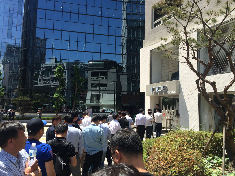 신분증을 집에 두고 온 장영배(35)씨는 “충남 당진에서 아이코스를 사려고 2시간 30분 걸려서 왔다”면서 “같이 온 친구에게 부탁하려 한다”고 말했다. 장씨와 친구 김정훈(35)씨는 회사 휴무일에 맞춰 아이코스를 구입하러 서울에 왔다. 김씨는 “SNS에 올라온 사진을 보고 호기심이 생겼다”면서 “올라온 후기를 보면 일반 전자담배와 다르게 목 넘김이 있다고 해 기대된다”고 말했다.