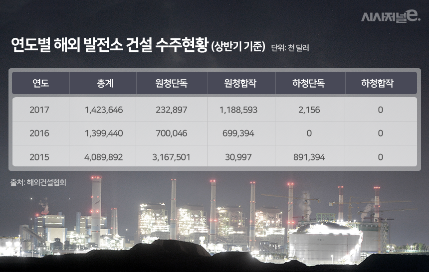 국내는 물론 해외 발전소 건설 업황도 건설업계에 녹록치 만은 않다. 5일 해외건설협회에 따르면 올해 상반기 건설사들이 해외 발전소 건설로 얻은 수주액은 총 14억2000만 달러로 나타났다. 이는 전년 동기(14억 달러) 대비 1.73% 감소한 수치다. 더욱이 최근 3년 간 상반기 기준 매년 발전소 건설을 통한 국내 건설사의 수주액은 꾸준히 감소했다.