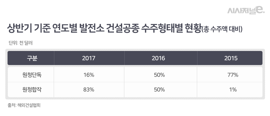 해외건설협회 관계자는 “발전소 건설은 후행 산업에 속한다. 산업단지가 건설되면 전력수요가 늘면서 발전소 건설도 자연스레 증가하기 때문이다. 중동 지역의 경우 정유공장이 들어서면서 발전소 수요도 증가했다. 다만 최근 저유가, 발전소 건설이 IPP 사업으로 전환되는 요인 등으로 중동 지역 발주가 지연되고 있다”며 “또한 중동 국가들이 사업다각화를 통해 비재생 에너지를 통한 발전소 프로젝트 발주에 신중한 상황이다. 이에 발주물량이 더욱 감소하고 있다”고 말했다.