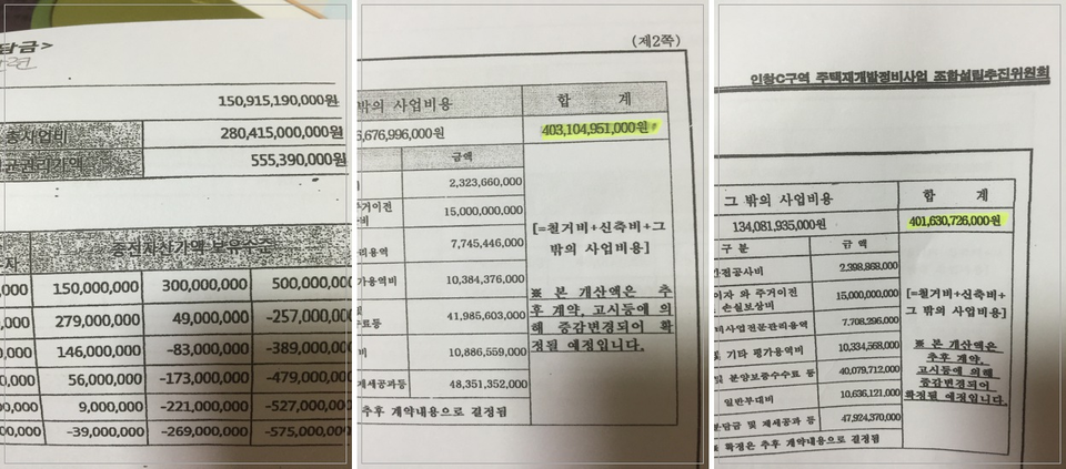시 측은 수도권 내 뉴타운 사업지의 사업비를 평균해 인창C구역 사업비를 도출했다고 비대위 측에 설명했다. 하지만 분양률 100%달성을 전제하는 등 비현실적인 비용산정 기준이 적용됐고, 상업지가 다수 있는 인창C구역의 특성을 무시한 결과라고 비대위 측은 반발하는 상황이다.