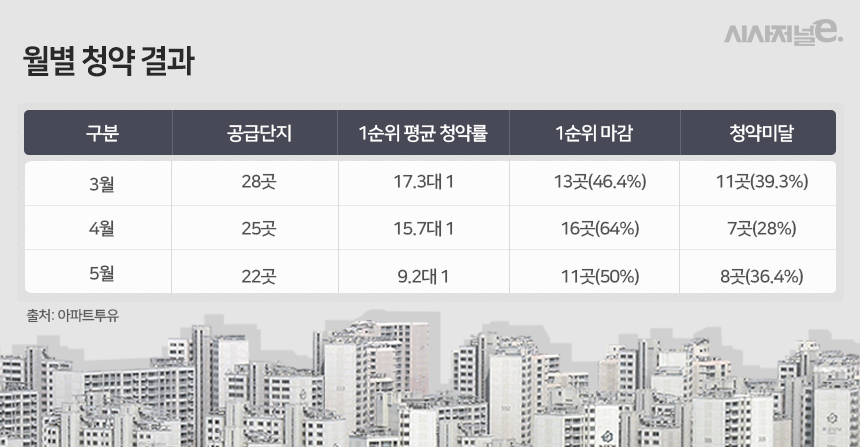지난달 청약시장 열기는 전반적으로 가라앉은 상황이다. 지난달 1순위 평균 청약률은 9.2대 1로 전월(15.7대 1) 대비 낮아졌다. 지난 3월 두자릿수 청약경쟁률을 회복한 이래 2개월 만에 한자릿수 경쟁률로 재진입했다. 또한 전체 공급단지 중 1순위 마감단지 비율은 46.4%로 전월(64%) 대비 낮아졌다. 또한 청약미달로 미분양이 발생한 아파트 단지비율도 같은 기간 28%에서 39.3%로 높아졌다.