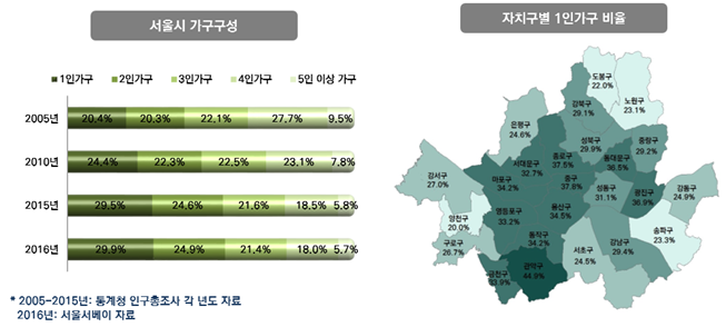 서울에 거주하는 시민의 절반 이상이 1~2인 가구다. 1~2인 가구 비율은 전체 가구의 과반인 54.8%로 나타났다. 구체적으로 1인‧2인 가구의 비율은 각각 29.9%, 24.9%로 집계됐다. 1인‧2인가구는 10년 새 각각 9.5%포인트(p), 4.6%포인트 증가했다.