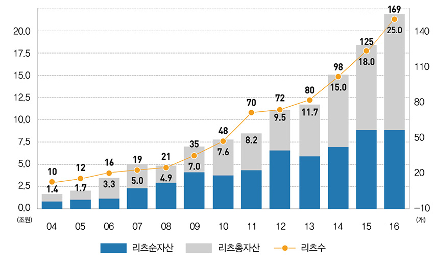 리츠는 지난 2012년 설립요건이 완화된 이후 5년 간 상승가도를 달렸다. 9일 국토교통부에 따르면 지난해 리츠가 운용하는 자산규모가 25조원에 이르는 것으로 나타났다. 신규로 인가받은 리츠 수는 169개로 확인된다. 자산규모, 리츠 수는 지난 2012년 대비 각각 3배, 2배 가량 증가했다.