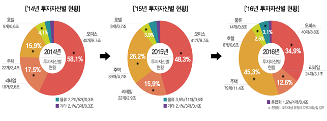 정부의 정책적 지원을 통해 리츠는 성장했다. 특히 행복주택, 기업형 임대주택인 뉴스테이 등 임대주택이 리츠 성장에 기여했다. 정부는 임대주택을 육성하면서 재원조달 방안으로 리츠를 주목해 설립요건완화, 투자장려책을 마련했다. 이에 지난해 주택 분야 리츠 비중은 전체 투자액의 절반 가량인 45.3%(11조4000억원)를 기록했다. 지난 3년 간 주택 분야 리츠 투자액이 꾸준히 증가한 결과다.
