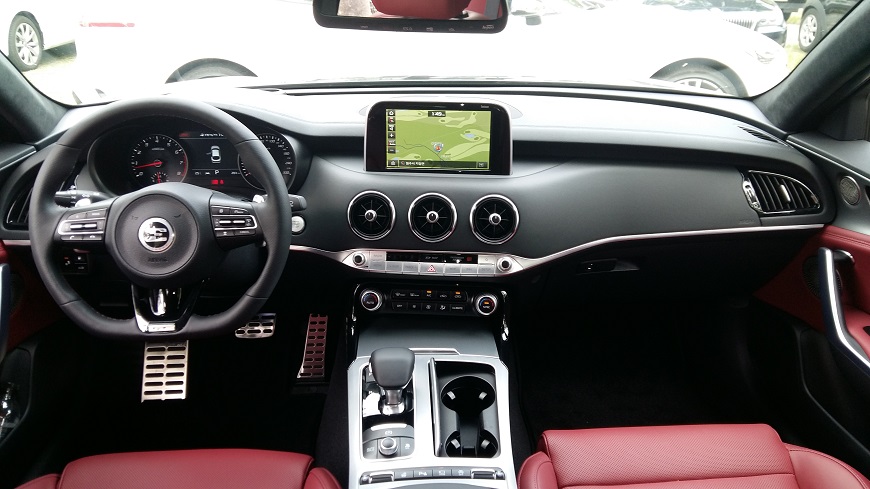 운전석에 앉자 나파 가죽 세미 버킷시트의 온 몸을 감싸안는 듯한 착좌감이 만족스럽다. D컷 스티어링휠은 차량의 스포티한 느낌을 강조했고, 스포츠 주행시 사용 빈도가 많아지는 패들시프트도 조작하기 용이한 위치에 배치됐다. 속도와 경로, 차간 거리 등 주행 정보를 제공하는 헤드업 디스플레이는 주간 주행에도 눈에 잘 들어올 정도로 시인성이 높다. 스티어링휠에서 조수석으로 길게 뻗은 항공기의 날개를 형상화한 대시보드와 스팅어에 첫 적용된 항공기 엔진을 닮은 스포크 타입의 원형 에어밴트(송풍구)도 이채롭다.