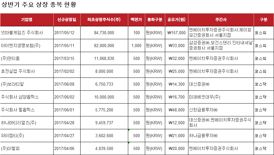 11일 시사저널이코노미가 집계한 5월까지 코스피와 코스닥 신규상장 기업의 총 공모금액은 4조3700억원을 기록했다. 코스피 시장에서는 넷마블게임즈와 아이엔지생명, 덴티움, 호전실업 등이 상장했고 코스닥에서도 25개 종목이 상장했다.