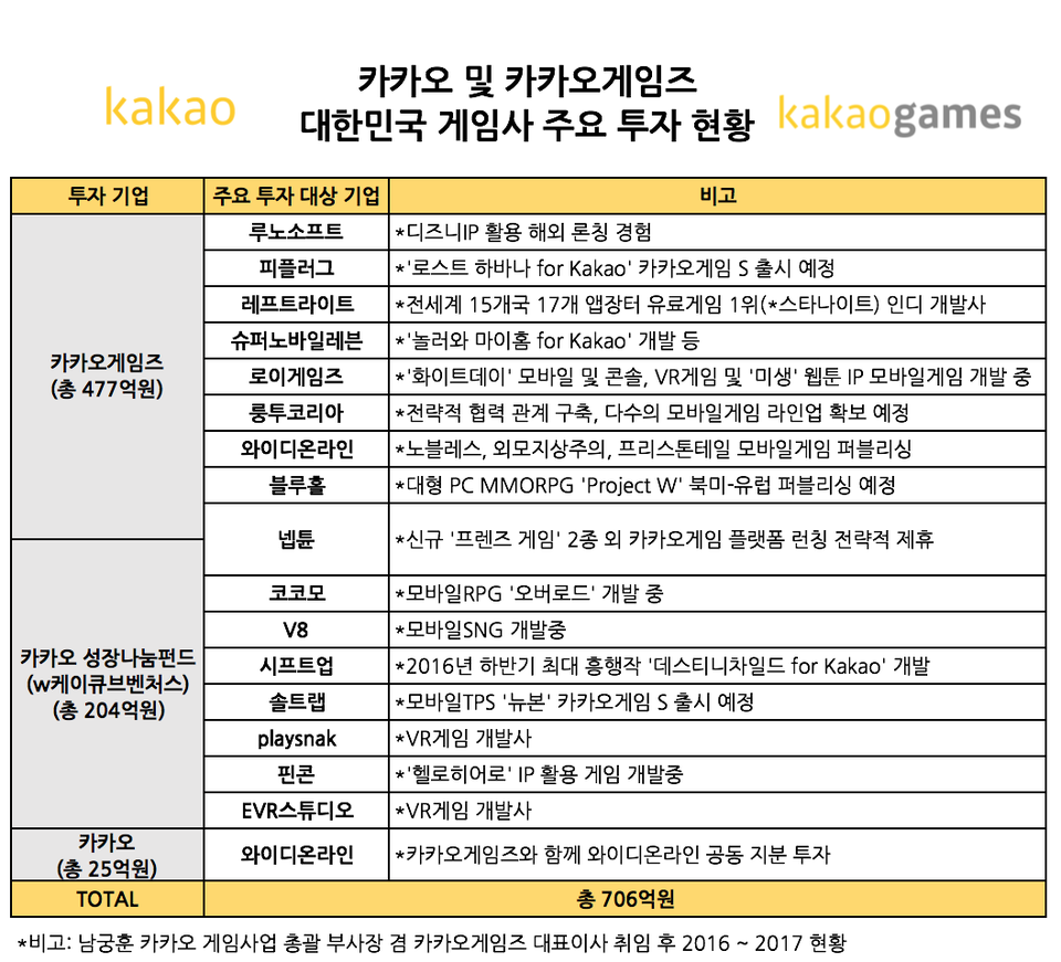 아울러 카카오는 투자 대상 기업들과 개발 중인 수십 종의 모바일, PC온라인, VR게임들을 올해 이후 카카오게임 플랫폼과 카카오게임즈 해외 법인을 통해 국내 및 글로벌 시장에 순차적으로 출시할 예정이다.