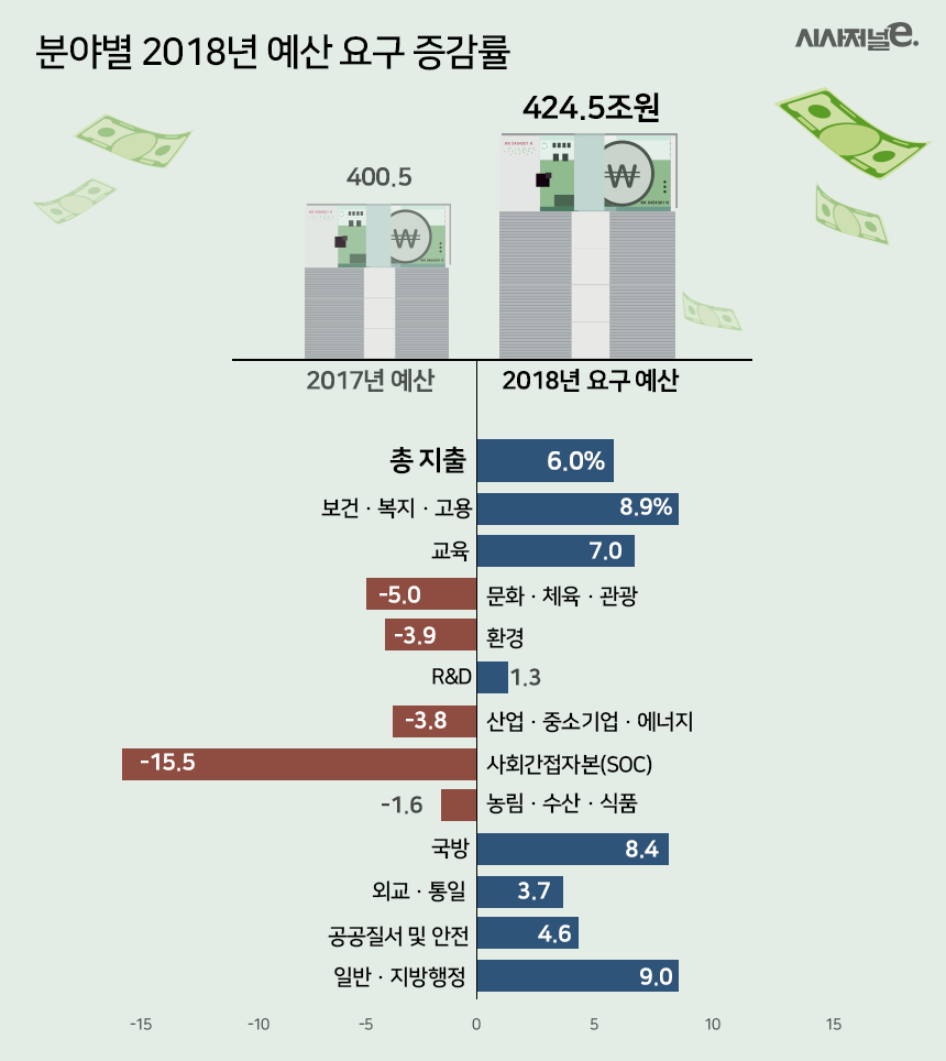 R&D는 4차 산업혁명 대응을 위한 핵심기반기술·ICT(정보통신기술) 융합예산 요구 등으로 1.3% 증가했다. 국방은 킬체인 등 북핵위협 대응 강화, 장병 처우 개선 등에 대한 소요로 8.4% 늘어났다.