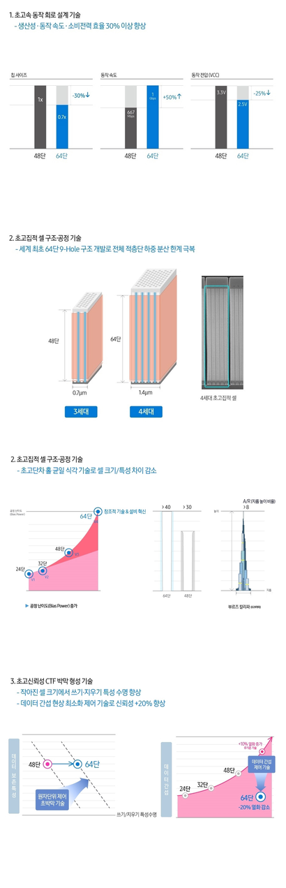 4세대(64단) V낸드에는 ‘초고집적 셀 구조·공정’, ‘초고속 동작 회로 설계’와 ‘초고신뢰성 CTF 박막 형성’ 등 3가지 혁신 기술이 적용됐다. 반도체업계에서는 4세대 제품이 3세대(48단) 제품과 비교해 속도와 생산성, 전력 효율 모두 30% 이상 향상됐다고 평가한다.