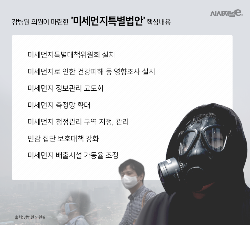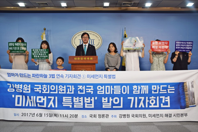 한편 이번 특별법안은 미세먼지 피해에 민감한 자녀를 둔 어머니 모임과 미세먼지해결시민본부 등 관련 시민단체들과 소통해 마련했다는 데 의미가 크다고 강 의원은 밝혔다. 강 의원은 특별법안을 마련하면서 문 대통령이 후보시절 간담회를 했던 전국 ‘맘카페’ 21여곳으로부터 의견수렴을 거치고 지난 12일 간담회를 열었다.