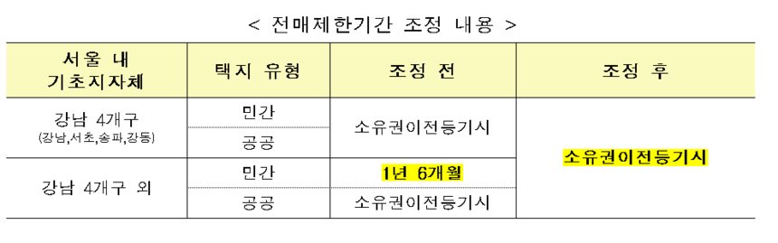 종전에는 강남4구 외 21개구의 택지별로전매제한기간이 차등 적용됐다. 11.3 부동산 대책에 따라 강남4개구 외 지역 민간택지는 전매제한기간이 1년 6개월이었다. 이번 조치로 해당 지역 민간택지도 공공택지와 동일한 전매제한기간이 적용된다. 주택법 시행령 개정안이 입법예고되는 19일 이후 실시되는 입주자 모집공고분부터 해당 규제가 적용된다.