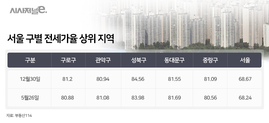 특히 서울 강북권을 중심으로 갭투자 세력이 몰릴 수 있다는 진단이 나오고 있다. 전세수급의 어려움으로 전셋값과 매매값의 차이가 적은 단지가 강북권에 다수 포진했기 때문이다. 지난달 기준 서울 지역 전세가율 상위 5개 지역은 성북구(81.69), 동대문구(81.69), 관악구(81.08), 구로구(80.88), 중랑구(80.56) 등으로 나타났다. 80%가 강북권에 위치했다. 강남 대비 적은 개발이 이뤄지면서 주택공급이 수요 대비 적기 때문이다.