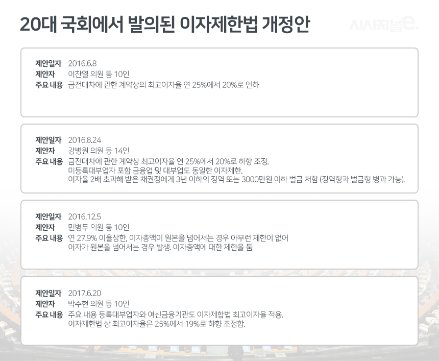 이에 따라 20대 국회 들어서도 이자제한법 관련 개정안은 그동안 계속 발의됐다. 지난해 6월 이찬열 의원이 대표발의한 이자제한법 개정안은 금전대차에 관한 계약상의 최고이자율 연 25%에서 20%로 인하하는 내용을 골자로 하고 있다.