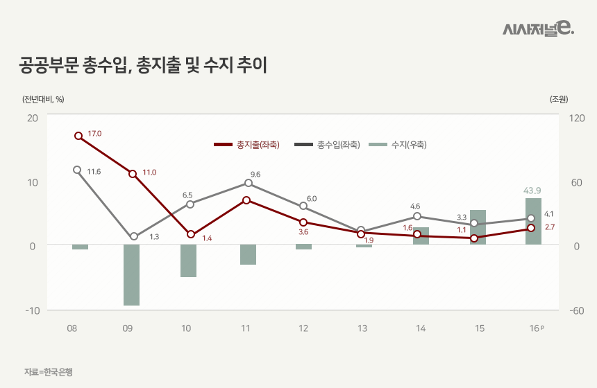 21일 한국은행이 발표한 ‘2016년 공공부문계정(잠정)’에 따르면 지난해 공공부문(일반정부+공기업) 수지(총수입-총지출)는 43조9000억원으로 전년 32조9000억원에서 11조원 가량 증가했다. 이는 3년 연속 흑자이자 2007년 관련 통계 작성 이후 최고치다.