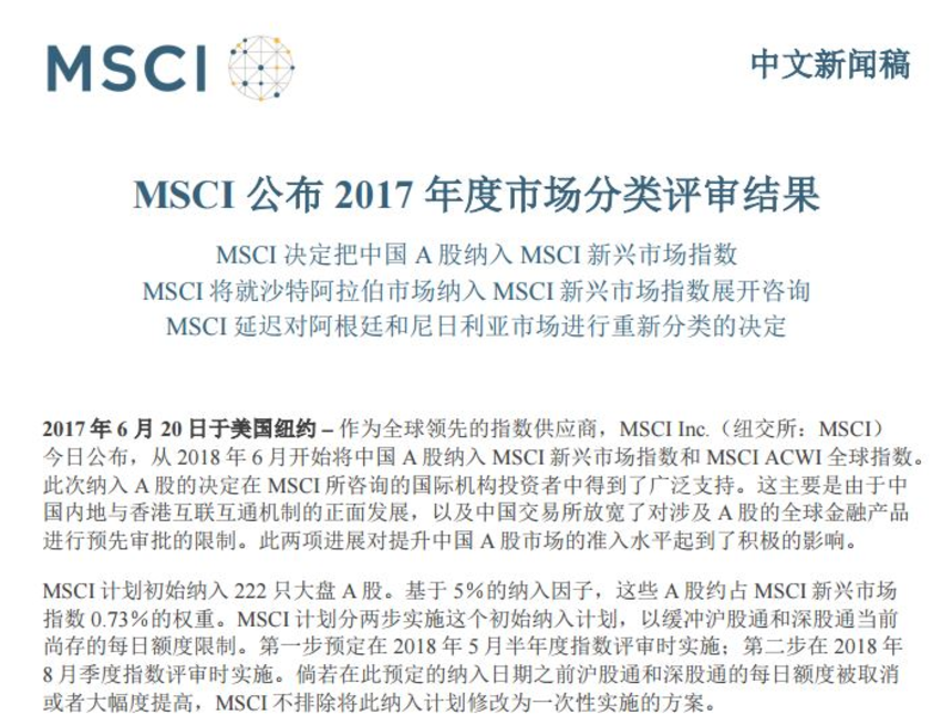 중국A주의 MSCI 편입이 갑자기 시장에 나타난 돌발 악재가 아니라 이미 수년간 준비됐던 일이라는 점도 자금이탈 우려를 제한하는 요소다. MSCI는 지난 2013년 중국A주를 편입 관찰 대상국 명단에 올렸고 4차례 검토후에 편입됐다.