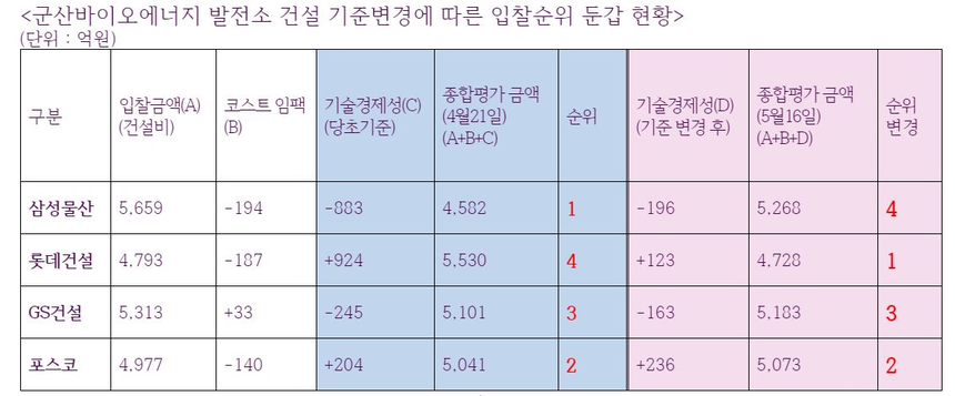 하지만 군산바이오에너지는 4월 21일 제출된 기술입찰결과를 확인한 결과 롯데건설이 이 평가항목에서 경쟁력이 현저히 떨어진다는 사실을 확인하고, 기동 횟수를 당초 15회에서 3회로 5분의1로 줄여 평가하도록 기준을 바꿨다. 이 기준 변경은 건설사들에게는 비밀로 부처진 상태에서 밀실에서 이뤄졌다. 아울러 당초 셧다운 후 16시간 뒤 재가동 기준을 보일러 온도 400도씨에서 다시 재가동하는 방식으로 기준을 변경했다.
