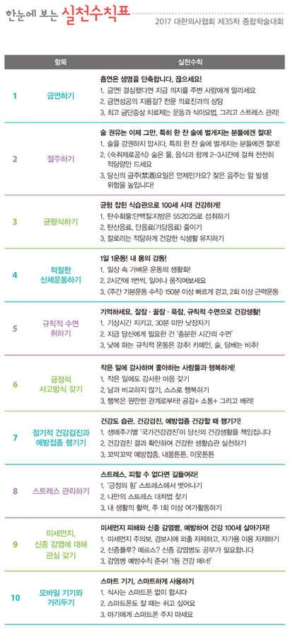 30일 대한의사협회(의협)은 서울 그랜드힐튼 호텔에서 열린 제35차 종합학술대회 개회식에서 국민 100세 건강 10대 수칙을 담은 ‘건강 십계명’을 발표했다고 밝혔다. 이는 의협 산하 25개 학회와 유관기관, 의료계 전문가 39명이 참여해 작성됐다.