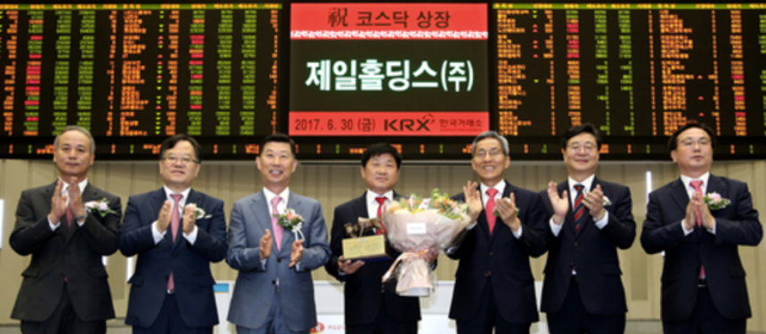 30일 코스닥 시장에서 제일홀딩스는 시초가 1만8650원 대비 400원(2.14%) 오른 1만9050원에 거래를 마쳤다. 이에 따라 종가 기준 코스닥 시가총액 12위에 올랐다. 상장 전 시장에서 예상하던 코스닥 시가총액 10위 보다는 낮은 순위지만 시초가가 낮게 형성됐다는 점을 감안하면 나쁘지 않은 데뷔다.