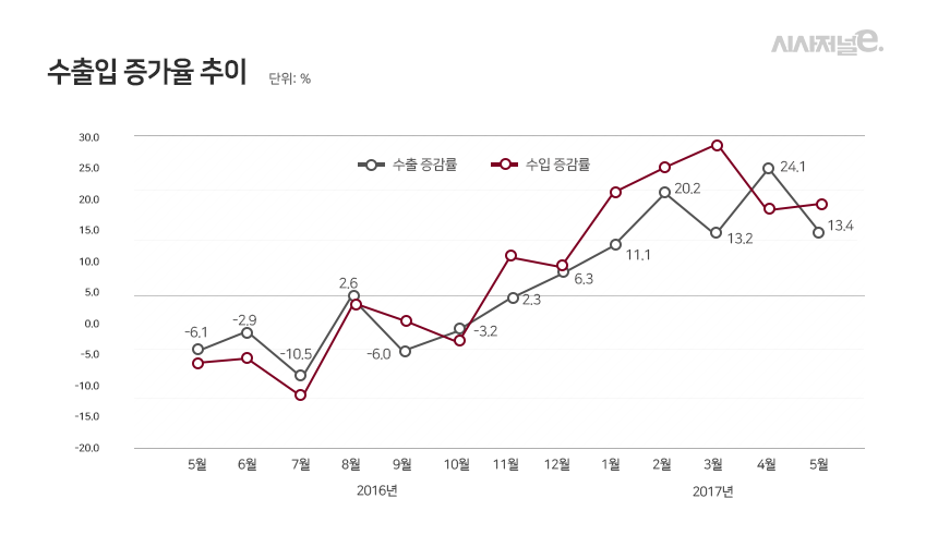 국내 수출 산업은 올해 상반기 지속적인 회복세를 보였다. 국내 수출은 지난해 11월 이후 7개월 연속 증가를 기록하고 있다. 특히 올해 1∼5월 수출은 지난해 같은 기간 대비 두 자릿수 증가율을 보였다. 올들어 5월까지 수출은 지난해 같은 기간과 비교해 16.4% 증가율을 기록했다. 지난해 부진에 따른 기저효과를 감안하더라도 높은 수치다.