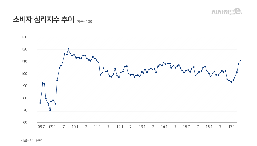 박근혜 전 대통령 탄핵 정국으로 시들었던 소비심리도 반등했다. 지난달 27일 한국은행이 발표한 ‘2017년 6월 소비자동향조사 결과’에 따르면 6월 소비자심리지수(CCSI)는 111.1로 2011년 1월(111.4) 이래 6년5개월만에 최고치를 기록했다. 또 CCSI는 올해 2월 이후 5개월 연속 상승하면서 소비심리 개선세가 뚜렷함을 보였다.