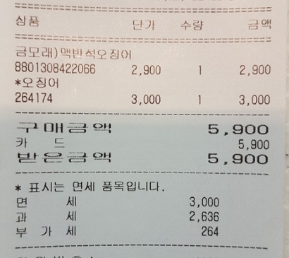 이날 이 씨는 오징어(3000원)와 맥반석오징어(2900원)를 더해 총 5900원을 지불했다. 그러나 이 씨가 지불한 두 상품의 순수 가격은 오징어 3000원과 맥반석오징어 2634원이다. 맥반석오징어 2900원에는 부가세 264원이 포함돼 있기 때문이다. 264원은 사업자가 부가세 신고기한 안에 세무서에 납부할 것이다.