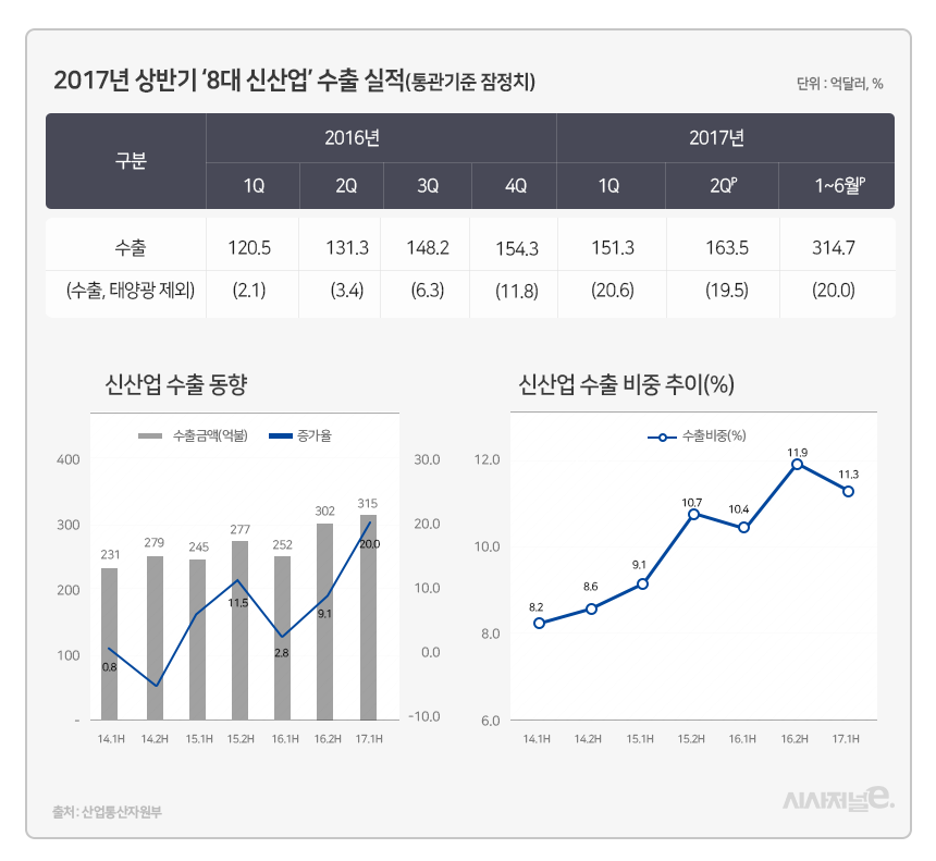 올 상반기 전기차와 첨단신소재 제품 등 8대 신(新)산업 수출액이 314억달러를 넘어섰다. 국내 전 산업 수출의 10%를 웃도는 수준이다. 특히 지난해 상반기와 비교하면, 국내 8대 신산업 수출액이 20%가 증가한 것으로 새로운 수출 효자로서 노릇을 톡톡히 하고 있다.