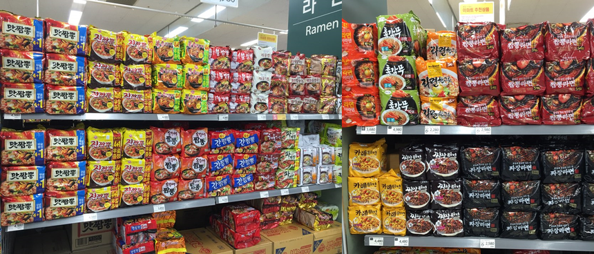 양사의 라면 코너에는 공통점이 있다. 노른자위엔 모두 오뚜기의 ‘함흥비빔면’과 ‘콩국수라면’이 있다.