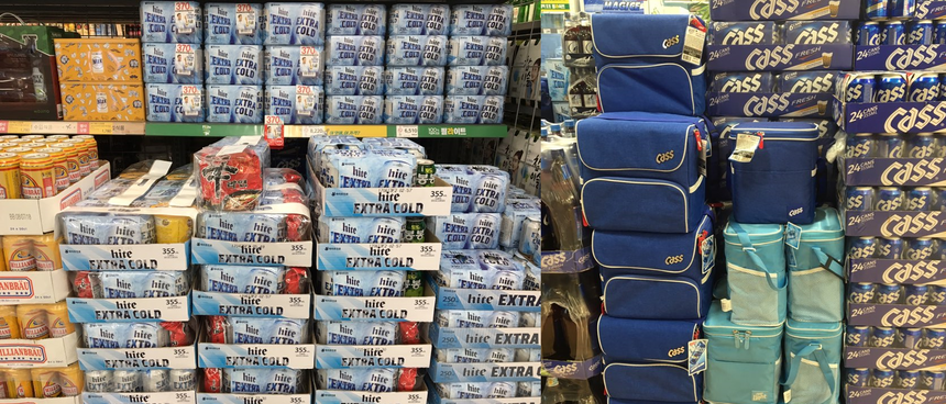 하이트진로의 하이트엑스트라콜드는 봉지라면 1개, 포도맛 음료 1개, 과자 1개 등과 묶어 팔고 있다. 맥주와 안주를 함께 팔고 있는 것이다. 야외 피서족을 겨냥한 판촉도 진행 중이다. OB맥주와 하이트진로는 355㎖ 짜리 캔을 쿨러백에 담아 판매하고 있다.