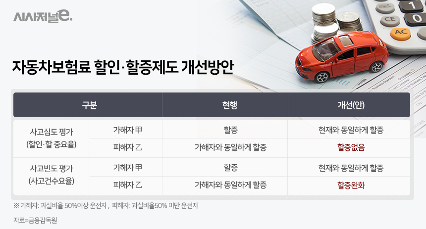 이에 피해자보다 가해자의 잘못이 큰 데도 가해자와 피해자의 보험료 할증 폭이 같은 것은 문제가 있다는 지적이 많았다. 금감원은 이런 지적을 반영해 피해자 보험료 할증 폭을 가해자보다 낮게 하는 방식으로 차등을 두도록 했다.