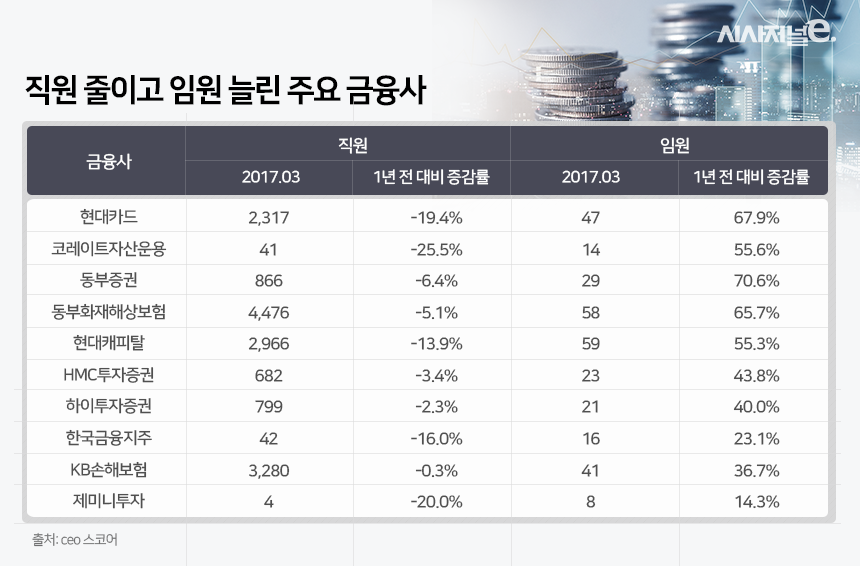 동부증권 역시 직원이 6.4%(59명) 줄었는데 임원은 70.6%(12명)나 급증했다. 동부화재(직원 5.1%↓, 임원 65.7%↑), 현대캐피탈(직원 13.9%↓, 임원 55.3%↑), KB손보(직원 0.3%↓, 임원 36.7%↑)도 같은 상황이었다.