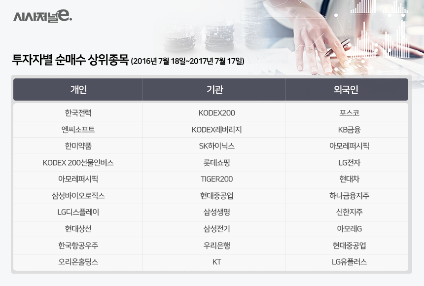 외국인은 금융주를 주로 매집했다. 지난 1년간 외국인 순매수 상위 10개 종목 중에서 3개가 금융주였다. KB금융은 1조700억원어치를 순매수했고 하나금융지주는 8372억원, 신한지주는 8184억원어치를 순매수했다. 외국인이 사들인 금융주 대부분이 주가가 상승했다. 추정 평균 매입가 대비 KB금융은 7.05%, 하나금융지주는 38.09%, 신한지주는 8.61% 올랐다.