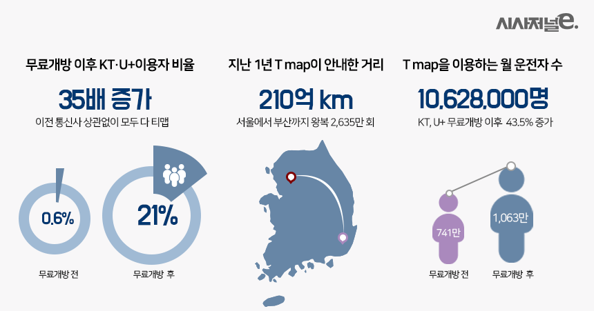 특히 경쟁 이동통신사 이용자들을 끌어안은 전략이 주효했다. T맵의 일 최대 이용자는 약 273만명에 달한다. 무료 개방 후 T맵의 1주당 교통 정보 수집 건수는 무료 개방 이전 21억 건에서 무료 개방 이후 37억 건으로 72% 증가했다.