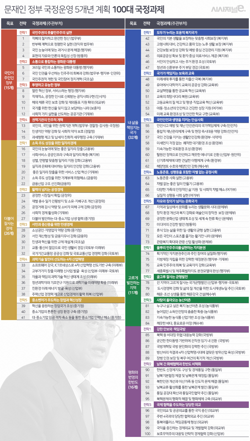 문재인 정부가 19일 국정운영 5개년 계획을 발표했다. 임기 5년간 국정운영 과제를 5대 목표, 20대 전략, 100대 과제로 분류해 선정·제시했다. 또 100대 과제와 별도로 새정부 국정비전을 부각할 수 있는 4대 복합·혁신과제를 중점 추진키로 했다. 시사저널e는 총 193쪽에 이르는 문재인정부 국정운영 보고서 중 경제정책만 분별해 J노믹스의 핵심 정책을 정리하고자 한다. [편집자주]